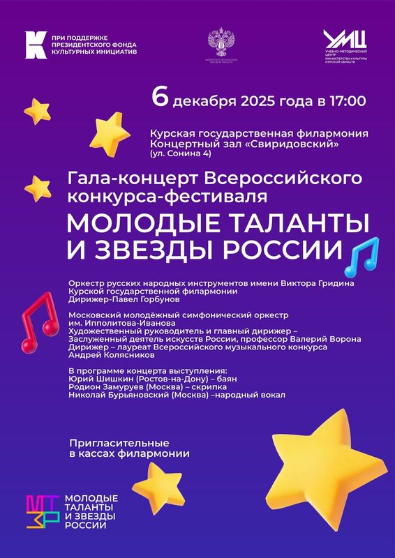Гала-концерт фестиваля состоится 06 декабря в 17:00 в Курской государственной филармонии в Концертном зале «Свиридовский», на одной сцене с одарёнными детьми России выступят оркестр русских народных инструментов имени Виктора Гридина Курской государственной филармонии, дирижер-Павел Горбунов и Московский молодёжный симфонический оркестр им. Ипполитова-Иванова, художественный руководитель, главный дирижер- заслуженный деятель искусств РФ Валерий Ворона.
