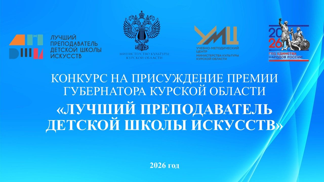 В апреле 2026 года состоится Конкурс на присуждение премии Губернатора Курской области «Лучший преподаватель детской школы искусств» , который проводится с целью выявления творческого потенциала преподавателей детских школ искусств Курской области, направленного на развитие региональной системы культуры в условиях ее модернизации и реализации федеральных государственных требований.